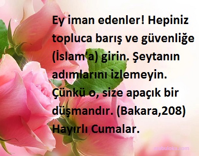 Ey iman edenler! Hepiniz topluca barış ve güvenliğe (İslam’a) girin. Şeytanın adımlarını izlemeyin. Çünkü o, size apaçık bir düşmandır. (Bakara,208) Hayırlı Cumalar.